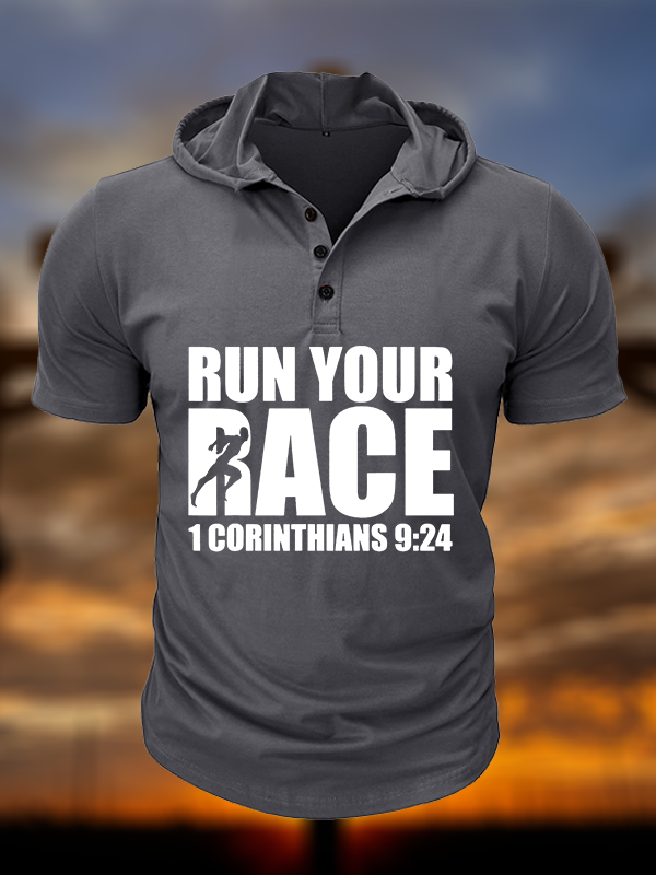 Run Your Race Corinthians Christian Hooded Henley T Shirt