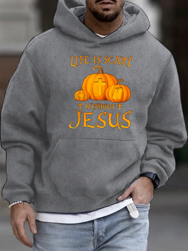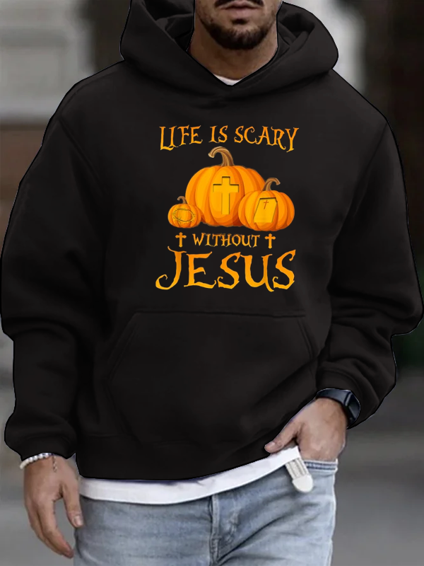 Men's Life Is Scary without Jesus Halloween Pumpkin Christian Cotton Hoodie