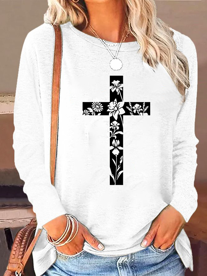 Cross Flower Christian Cotton Women's Long Sleeve T-Shirt