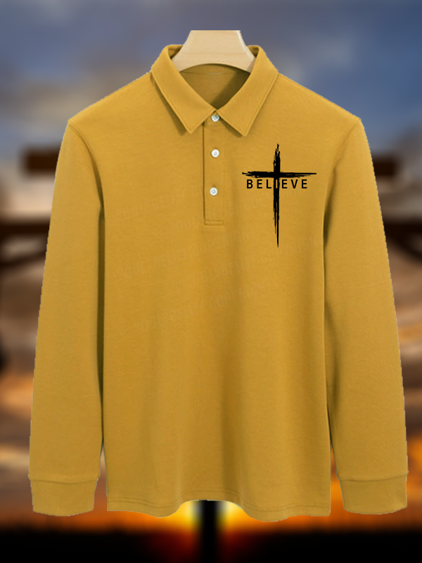 Believe Cross Jesus Christian Cotton Long-sleeve Polo Shirt