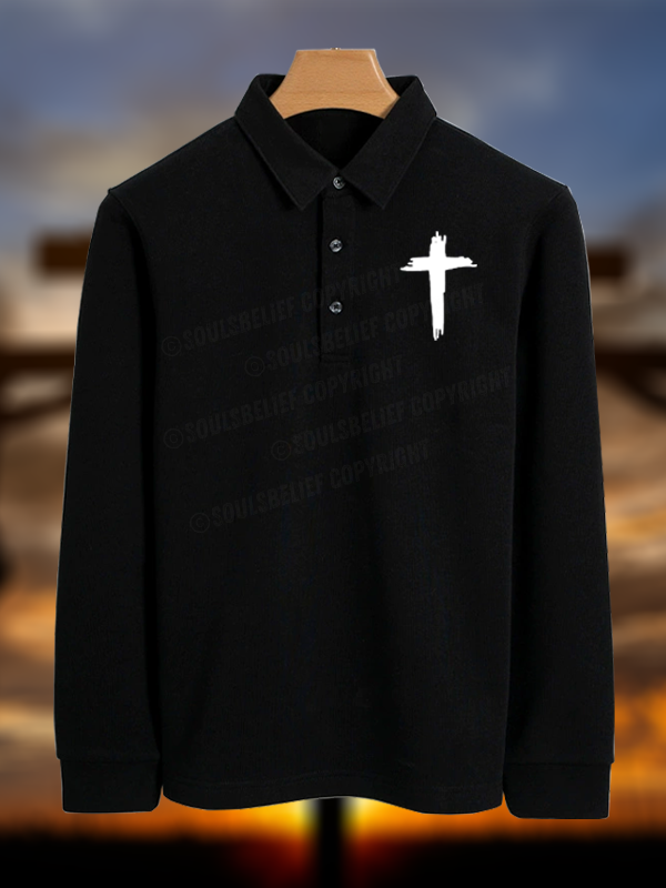 Cross Printed Christian Cotton Long-sleeve Polo Shirt