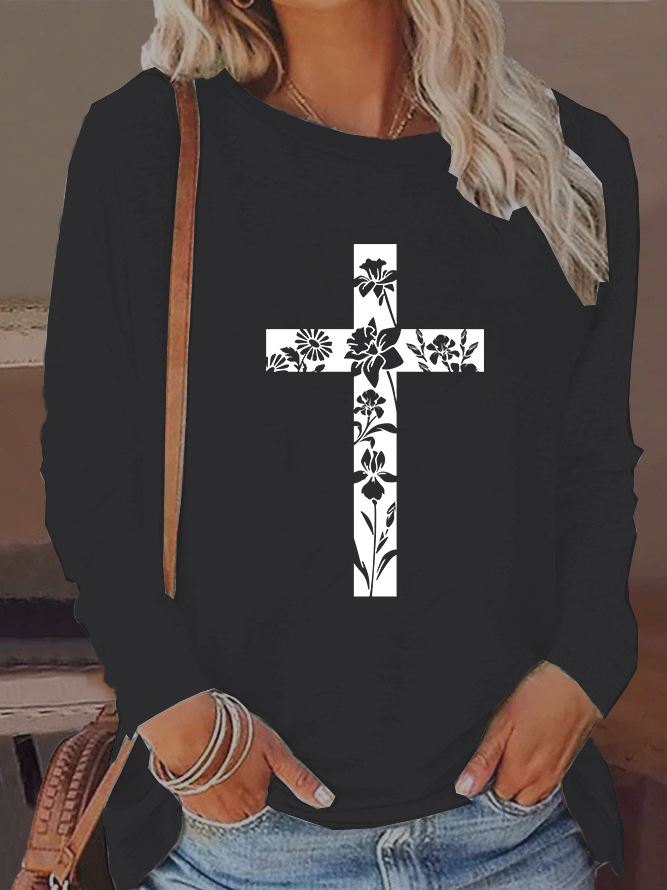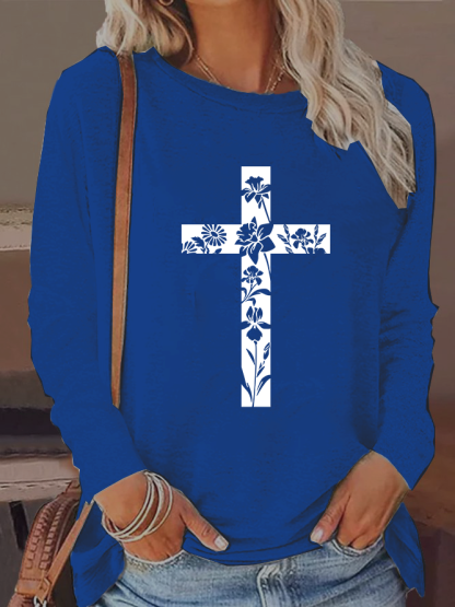 Cross With Flowers Christian Cotton Women's Long Sleeve T-Shirt