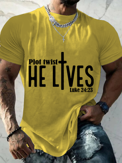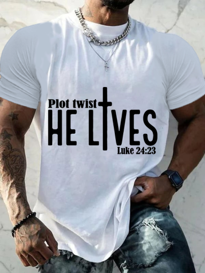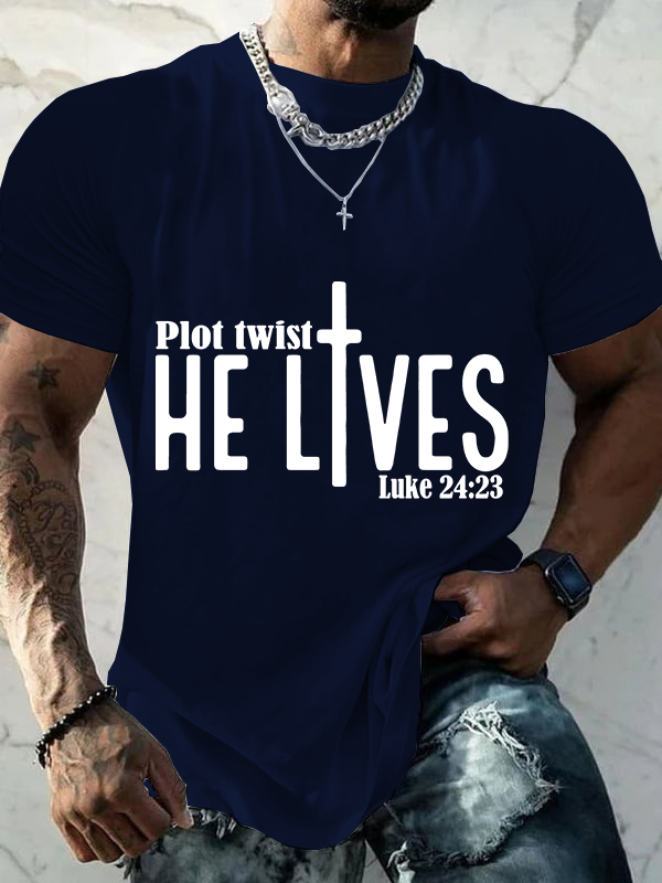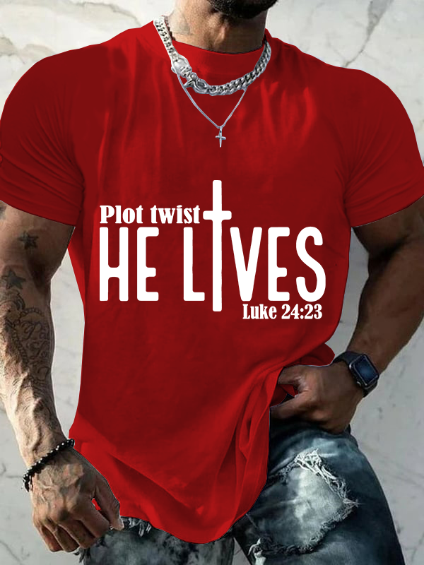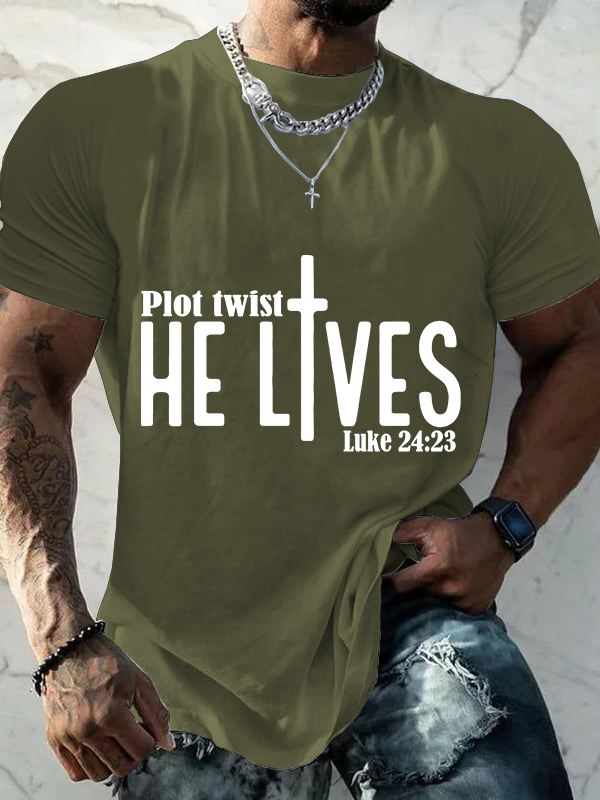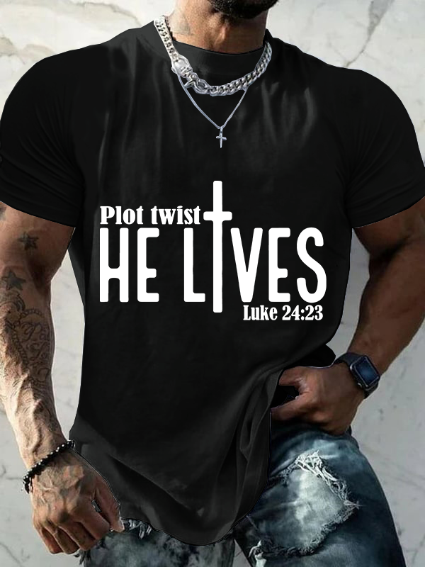 Plot Twist He Lives Luke 24:23 Christian Cotton T-Shirt