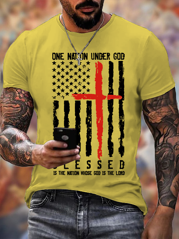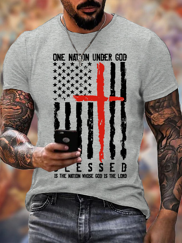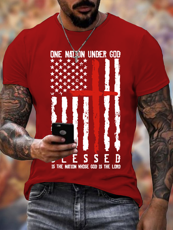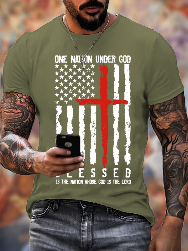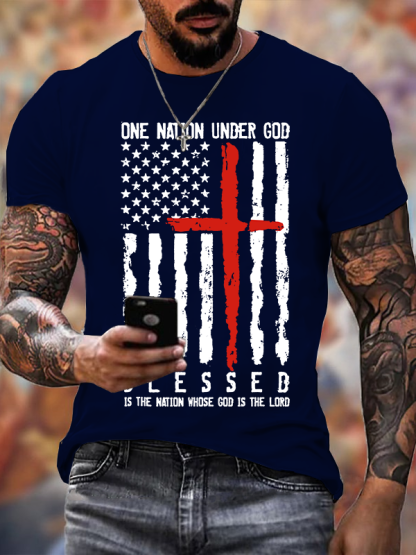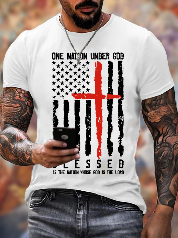 Blessed One Nation Under God 4th Of July US Flag Jesus God Christian Cotton T-Shirt