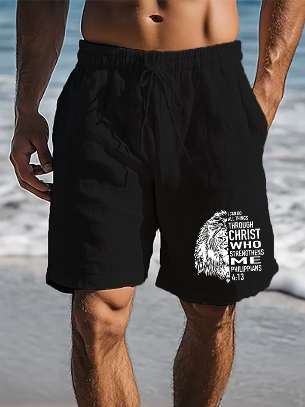 Men's Philippians 4:13 Verse Lion I Can Do All Things Through Christ Christian Beach Shorts
