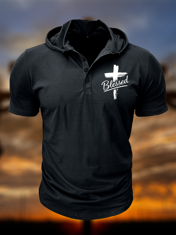Blessed Cross Hooded Henley T Shirt