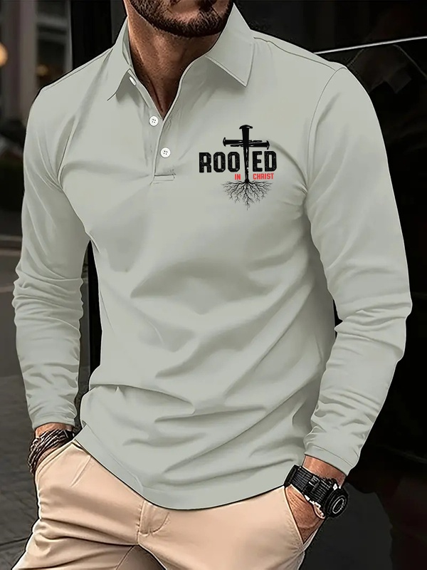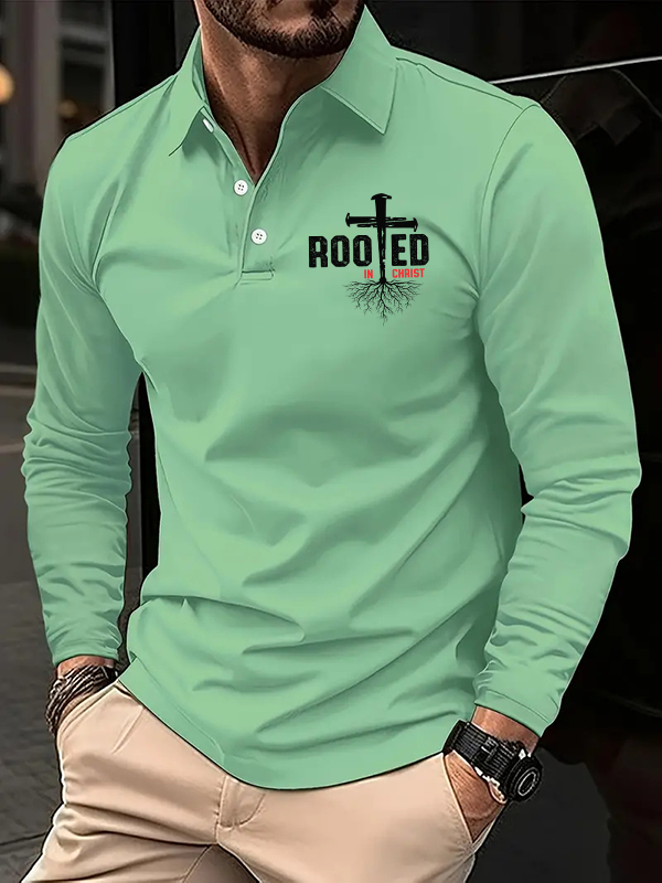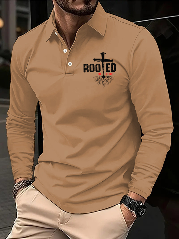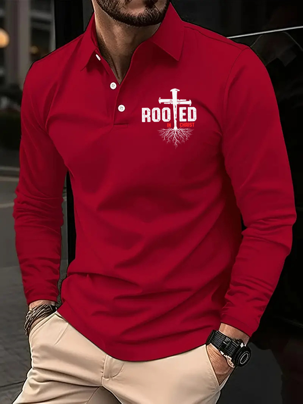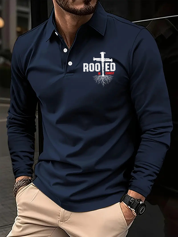 Rooted In Christ Christian Cross Jesus Long Sleeve Polo Shirt